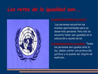 Este documento trata sobre la vida en sociedad y los desafíos de la igualdad. Explora temas como la igualdad económica y social, la igualdad política y jurídica, la solidaridad, la discriminación y la exclusión social. También analiza las causas de la discriminación como la falta de recursos y las diferencias físicas o de comportamiento. Aborda conceptos como el racismo, la xenofobia y formas de resolver la convivencia entre culturas. Finalmente, examina la lucha por la igualdad entre hombres y mujeres y las leyes de prote