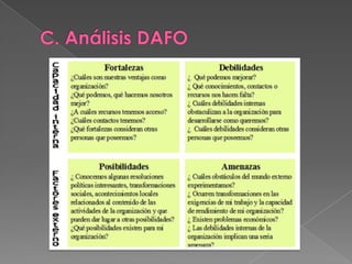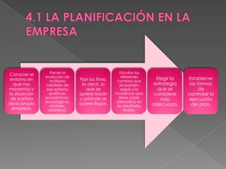 El documento presenta los pasos clave para la planificación estratégica y operativa de una empresa. En resumen: 1) Se analiza el entorno interno y externo para fijar los objetivos. 2) Se establece la estrategia a seguir considerando las fortalezas, debilidades, oportunidades y amenazas. 3) Se diseña el plan de marketing con el programa de acción y sistemas de control para alcanzar los objetivos planteados.