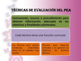 Este documento describe diferentes técnicas y instrumentos de evaluación del proceso de enseñanza-aprendizaje en informática educativa. Explica que las técnicas se refieren a cómo se llevará a cabo la evaluación, mientras que los instrumentos son las herramientas concretas que se usarán. También distingue entre evaluación inicial, formativa, sumativa y continua, las cuales proveen información a lo largo de todo el proceso educativo.