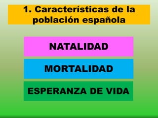 Este documento describe las características demográficas de la población española. Explica que la natalidad ha disminuido debido a factores como la incorporación de la mujer al trabajo y el retraso de la maternidad. También analiza la evolución de la esperanza de vida y la distribución desigual de la población en España, con mayor concentración en las zonas costeras y Madrid. Por último, clasifica a la población en activa, que trabaja principalmente en el sector servicios, e inactiva.