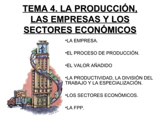 El documento habla sobre la producción, las empresas y los sectores económicos. Explica que la empresa es la unidad básica de producción y que el proceso de producción transforma los factores productivos como la tierra, el trabajo y el capital en productos terminados. Además, describe los tres sectores económicos principales - primario, secundario y terciario - y introduce el concepto de frontera de posibilidades de producción para ilustrar conceptos como la escasez de recursos y el coste de oportunidad.