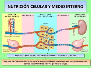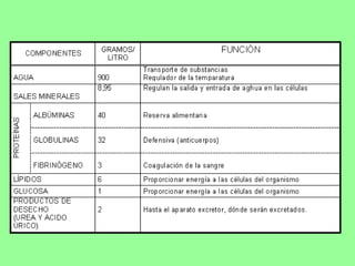 El documento describe el sistema circulatorio humano, incluyendo la sangre, vasos sanguíneos, corazón, sistema linfático y enfermedades relacionadas. Explica que la sangre transporta nutrientes, oxígeno y desechos a través de arterias, capilares y venas. El corazón bombea la sangre a través de dos circuitos. El sistema linfático incluye vasos, ganglios y conductos linfáticos que transportan líquido intersticial y células inmunes.