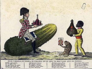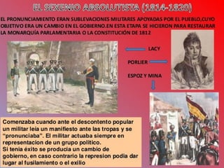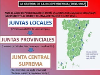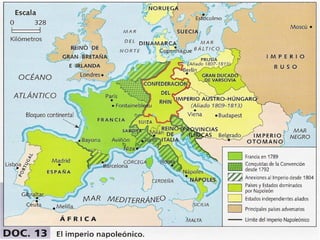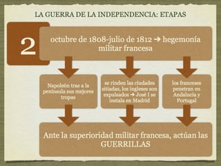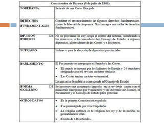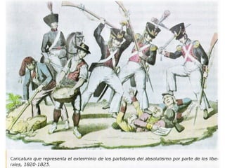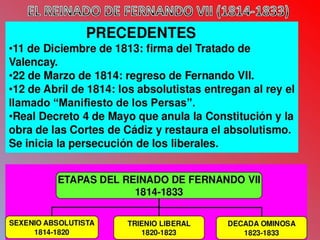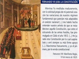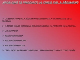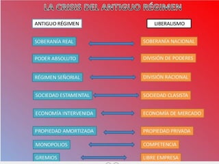 El documento resume la crisis del Antiguo Régimen en España entre 1788 y 1833. Explica que el reinado de Carlos IV estuvo marcado por la debilidad del rey y el gobierno de su valido Godoy, lo que llevó a una situación de crisis económica y descontento social. La invasión francesa en 1808 inició la Guerra de Independencia contra Napoleón, durante la cual se promulgó la Constitución de Cádiz de 1812 que trajo los ideales liberales a España.