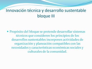 Este documento trata sobre la innovación técnica y el desarrollo sustentable. Busca desarrollar sistemas técnicos que consideren los principios del desarrollo sustentable e incorporen actividades compatibles con las necesidades de la comunidad. Propone alternativas a problemas técnicos para reducir riesgos de acuerdo con criterios de sustentabilidad. También discute el papel de la tecnología en el cambio social y la resolución de problemas a través de proyectos tecnológicos comunitarios.