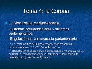 Este documento resume el tema 4 de la asignatura de Derecho Constitucional y Autonómico sobre la Corona en España. Explica que España es una monarquía parlamentaria según la Constitución y que la Corona es la institución permanente que representa la unidad y permanencia del Estado. Detalla que el Rey es el Jefe de Estado y está sujeto a la Constitución, y que la sucesión sigue el orden de primogenitura preferentemente por varones. Además, explica que el Rey actúa con refrendo de otros ór