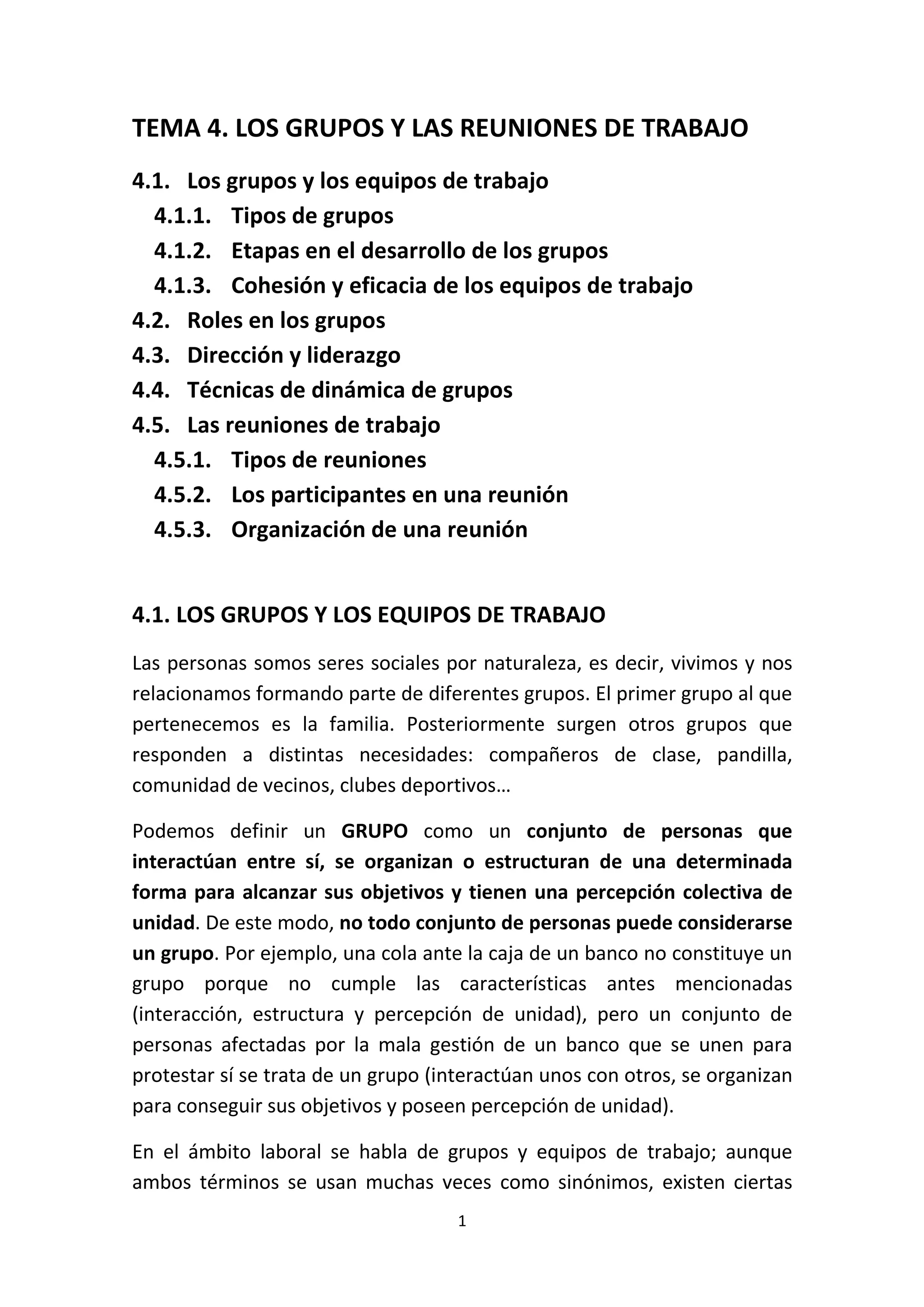 Este documento trata sobre los grupos y equipos de trabajo. Explica los tipos de grupos, las etapas en el desarrollo de los grupos, la importancia de la cohesión grupal y los roles dentro de los grupos. También aborda la dirección, el liderazgo y los estilos de liderazgo, así como las ventajas de trabajar en equipo frente al trabajo individual.