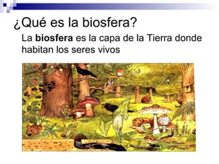 La biosfera es la capa delgada que abarca la troposfera, litosfera e hidrosfera donde habitan los seres vivos. En la troposfera viven principalmente microorganismos, en la hidrosfera animales y plantas acuáticos, y en la litosfera más de 250 mil especies vegetales, más de un millón de especies animales e incluye a los seres humanos. El suelo se compone de elementos sólidos, líquidos y gases y constituye la capa sobre la que crece la vegetación y donde habitan micro