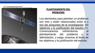 Este documento describe los elementos para plantear un problema de investigación. Explica que el planteamiento del problema, la delimitación y los objetivos son tres elementos relacionados. Detalla los cinco pasos para delimitar el objeto de investigación: 1) delimitación espacial, 2) delimitación temporal, 3) delimitación semántica, 4) selección del problema, y 5) determinación de recursos. También explica que la justificación muestra las ventajas de resolver un problema y debe identificar claramente el problema, sus causas, efectos y cómo se solucionará.