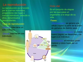 El documento describe los procesos de reproducción en organismos vivos. Explica que la reproducción puede ser asexual o sexual. En la reproducción asexual un solo individuo genera descendencia mientras que en la sexual se requieren dos individuos. También describe las etapas del ciclo vital como la reproducción, desarrollo embrionario y crecimiento. Explica los tipos de reproducción, fecundación, desarrollo y dispersión de semillas en plantas.