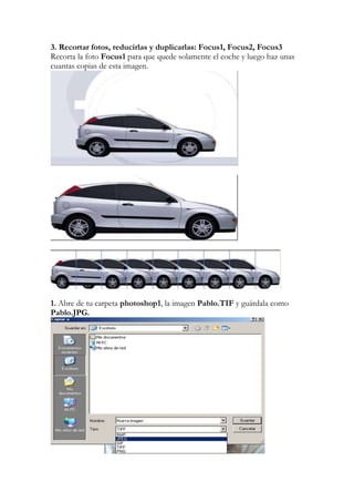 Este documento presenta varios ejercicios de diseño gráfico y edición de imágenes en Photoshop. Los ejercicios incluyen aplicar efectos como voltear e invertir colores, recortar imágenes, crear composiciones con múltiples capas, y diseñar portadas y logotipos. El objetivo es que los estudiantes practiquen diferentes herramientas y técnicas de edición y diseño de imágenes en Photoshop.