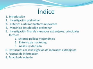 Este documento trata sobre la selección de mercados extranjeros. Explica que el proceso de selección implica una investigación preliminar para identificar mercados potenciales seguida de una investigación más profunda de los factores políticos, económicos, de marketing y de riesgo de cada mercado. Luego, los mercados son evaluados usando criterios como el tamaño del mercado, tasas de crecimiento y ventaja competitiva para seleccionar el mercado más estratégico para la empresa.