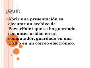 Este documento proporciona instrucciones para abrir presentaciones de PowerPoint guardadas previamente en un computador, USB o correo electrónico, incluyendo pasos para abrir presentaciones específicas como "Prueba2", "Ejercicio G2", y "Ejercicio G1" utilizando el historial de documentos recientes.