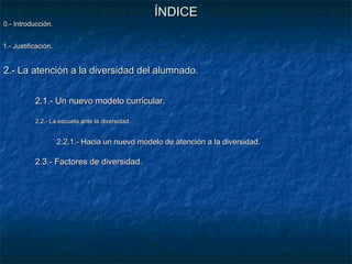 Este documento describe las estrategias y medidas para atender a la diversidad del alumnado en la escuela primaria. Aborda los principios de igualdad y equidad, y las medidas organizativas, curriculares y didácticas necesarias para apoyar a todos los estudiantes. También analiza las necesidades específicas de apoyo educativo para el alumnado con discapacidades o altas capacidades, así como para aquellos con incorporación tardía al sistema educativo. El objetivo es garantizar una educación inclusiva y de calidad para toda la población