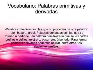 Este documento contiene información sobre varios temas relacionados con la lengua española, incluyendo vocabulario sobre palabras primitivas y derivadas, ortografía sobre la acentuación de diptongos y triptongos, gramática sobre los grados del adjetivo calificativo, y expresión escrita y oral sobre la interpretación y escritura de pies de fotografía.