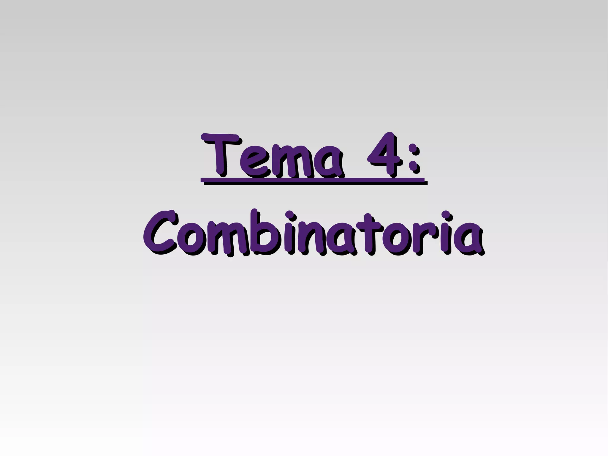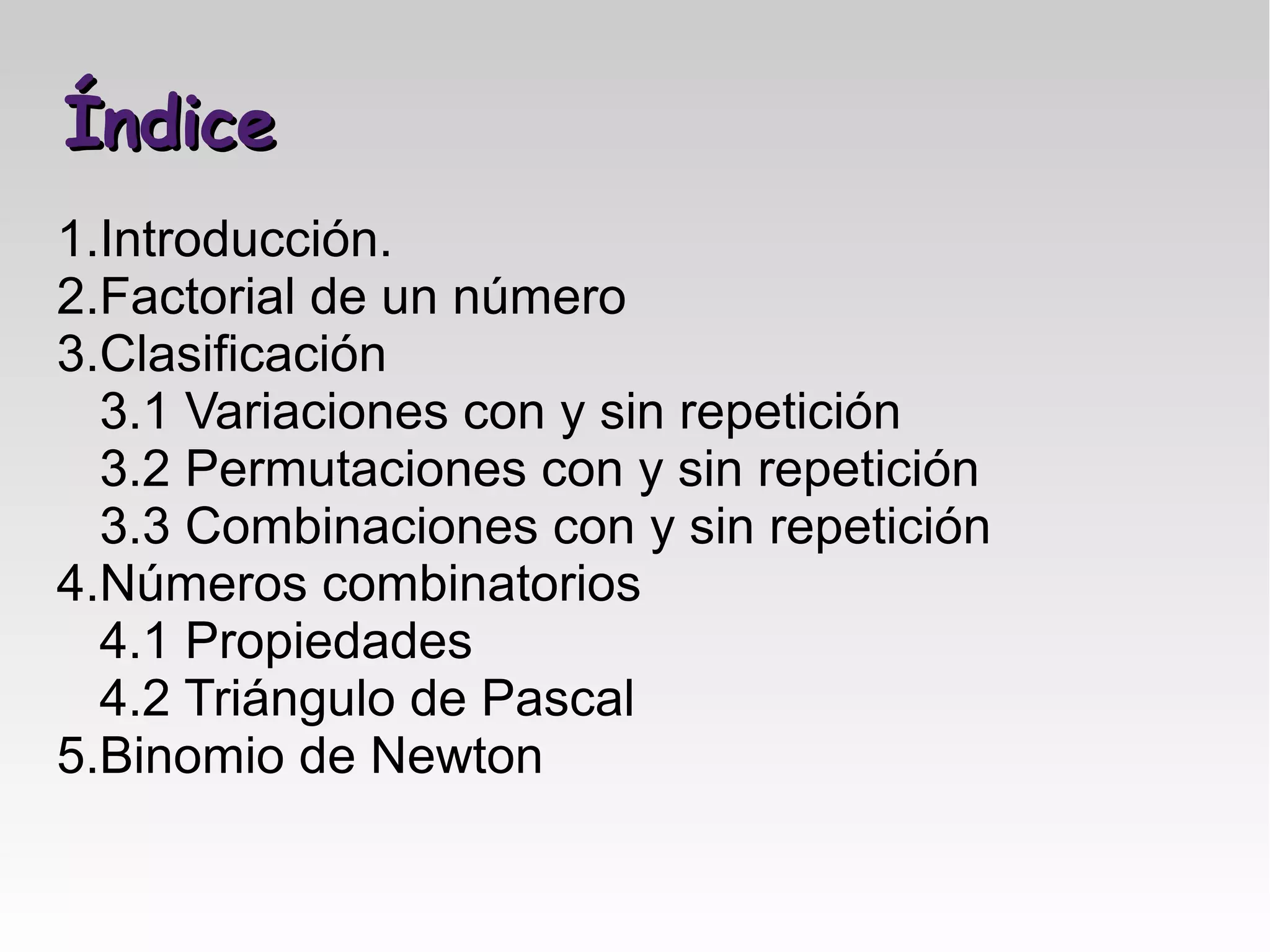 Este documento trata sobre la combinatoria. Explica conceptos como factoriales, variaciones, permutaciones y combinaciones con y sin repetición. También cubre propiedades de los números combinatorios como el triángulo de Pascal y cómo se calculan usando el binomio de Newton.