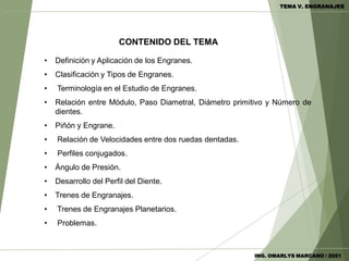 Este documento trata sobre los engranes y contiene información sobre su definición, clasificación, terminología, relaciones entre sus características y diseño. Explica que los engranes son ruedas dentadas que transmiten movimiento entre ejes y pueden clasificarse en cilíndricos, cónicos, hipoides y tornillos sin fin. También describe cómo se relacionan sus parámetros como el módulo, diámetro y número de dientes, y cómo se desarrolla el perfil del diente. Finalmente, introduce los trenes de engranes simple