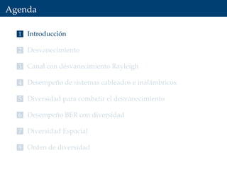 El capítulo 4 del documento de Francisco Sandoval se centra en la propagación de ondas, abordando el fading y la diversidad en sistemas de comunicación inalámbricos y cableados. Se discuten diferentes tipos de desvanecimiento, el impacto del canal con desvanecimiento Rayleigh y la importancia de la diversidad para mejorar el rendimiento del sistema. Además, se presentan estándares de tecnologías móviles 2G a 4G y conceptos estadísticos relacionados con el coeficiente de desvanecimiento.