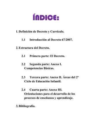 Este decreto establece el currículo para el segundo ciclo de educación infantil en Castilla-La Mancha. Se compone de cuatro partes: 1) el decreto, 2) anexo I sobre competencias básicas, 3) anexo II sobre áreas curriculares, y 4) anexo III sobre metodología. El decreto define la estructura curricular en torno a tres áreas: autoconocimiento, entorno, y lenguajes. Promueve el desarrollo de capacidades a través del juego, el respeto, y la interacción