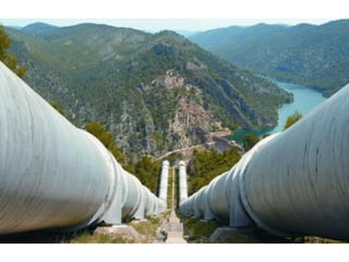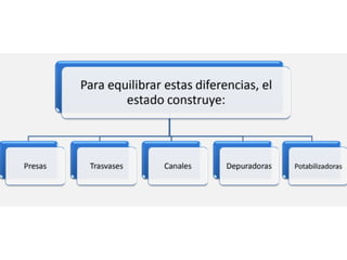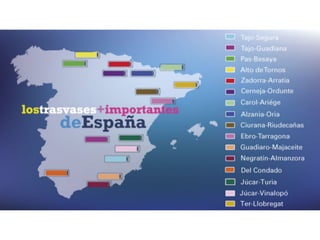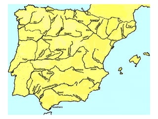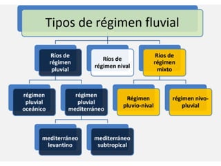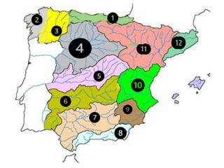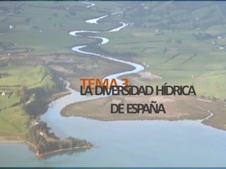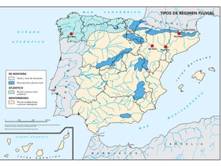 Este documento describe la diversidad hídrica de España, incluyendo sus principales ríos y cuencas fluviales, los diferentes regímenes hidrológicos, y otros recursos hídricos como lagos y acuíferos. Divide el territorio español en 11 cuencas hidrográficas que se gestionan a través de confederaciones hidrográficas. Explica los conceptos de caudal, régimen fluvial y tipos de régimen como nival, pluvial y mixtos. También presenta ejemplos de diferentes