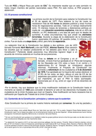La Constitución de 1978 estableció un Estado descentralizado de las autonomías tras la dictadura franquista. Fue elaborada por un comité de siete políticos de diferentes partidos y aprobada por referéndum en 1978. Define a España como una monarquía parlamentaria y garantiza derechos y libertades fundamentales. Además, reconoce la autonomía de las regiones y provincias.