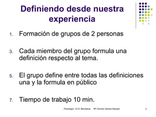 El documento trata sobre la percepción. Explica que la percepción es el proceso mediante el cual los individuos organizan y dan sentido a la información sensorial que reciben del entorno, la cual depende de factores internos como la experiencia y atención, y factores externos como los estímulos. La percepción consta de varias fases: detección de los estímulos por los sentidos, su conversión a señales nerviosas, y el procesamiento e interpretación de la información en el cerebro.