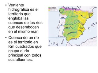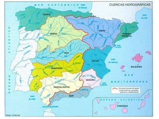 1) La cuenca del Duero es la más caudalosa debido a su gran extensión que abarca 97,290 km2. 2) El Duero tiene un caudal medio de 660 m3/segundo en su desembocadura, el más alto de los ríos españoles. 3) A pesar de su alto caudal, el Duero tiene un caudal relativo medio, entre 6 y 20 m3/km2/segundo, lo que indica una adecuada relación entre su caudal y extensión de cuenca.