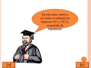 Este documento explica cómo completar los formularios TC1 y TC2 para realizar la liquidación a la Seguridad Social. Detalla las cuatro bases de cotización y las cuotas de cotización de la empresa y el trabajador. Para completar el TC1, la empresa paga su parte y la del trabajador. Para el TC2, se debe incluir el nombre abreviado del trabajador y los códigos correspondientes a las bases de cotización. Además, proporciona un ejemplo con dos trabajadores para demostrar cómo completar estos formularios.