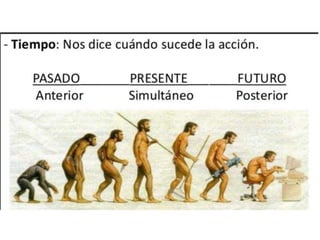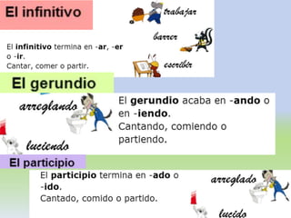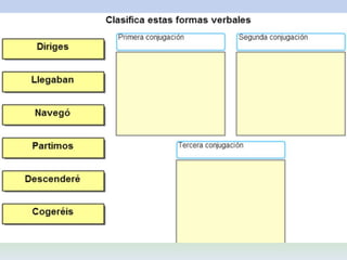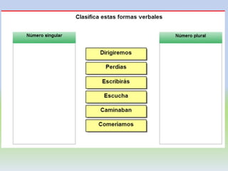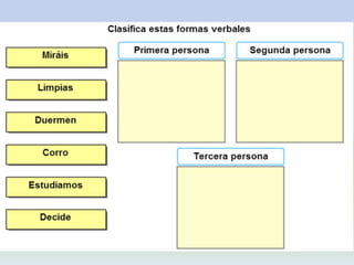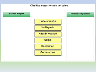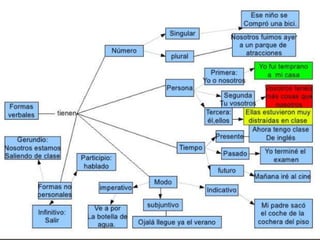 El documento habla sobre los verbos. Explica que los verbos son palabras que indican acciones, estados o procesos. Describe las diferentes partes de los verbos como la raíz, desinencia, persona, número, tiempo, modo, aspecto, y clases de verbos como regulares e irregulares. También analiza los diferentes tipos de conjugación verbal y sus características.