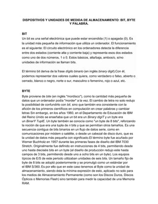 El documento describe diferentes unidades de medida de almacenamiento como el bit, el byte y la palabra. Explica que un bit representa un valor binario de 0 o 1, un byte es una secuencia de 8 bits, y una palabra es una secuencia de bits que se manejan como un conjunto por la máquina y su tamaño depende de la arquitectura. También cubre códigos de caracteres como ASCII y EBCDIC, formas de representar números con signo, y tipos de errores en la manipulación de datos numéricos.