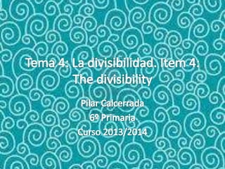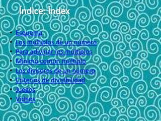 Este documento presenta información sobre la divisibilidad y los múltiplos de los números. Explica cómo calcular el mínimo común múltiplo de dos o más números y enumera los divisores de un número dado. Además, proporciona criterios para determinar si un número es divisible por 2, 3, 5, 9 o 10 sin realizar la división. Por último, incluye secciones sobre juegos y videos relacionados con este tema.