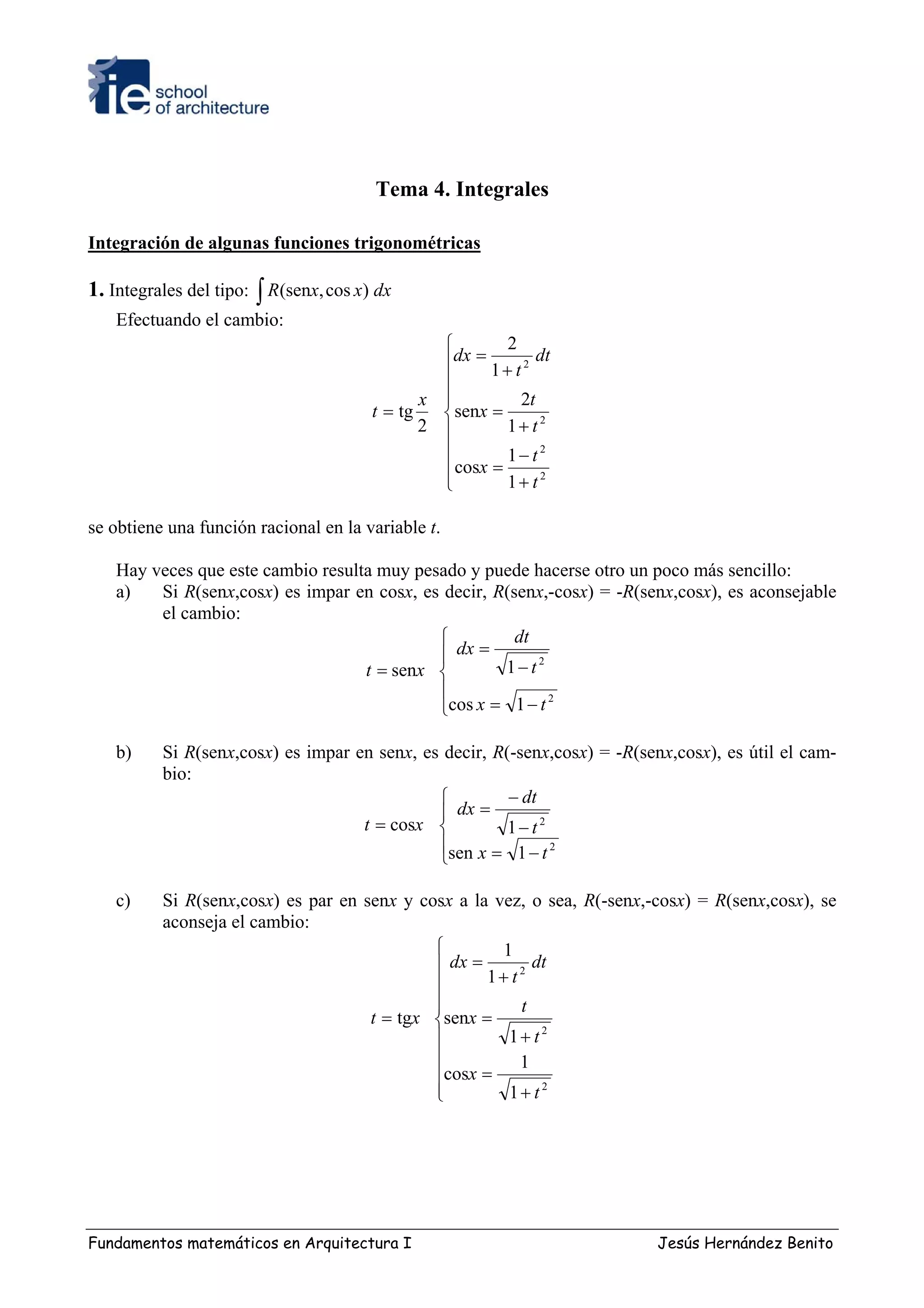 Este documento presenta diferentes tipos de integrales y los métodos para resolverlas. Explica cómo integrar funciones trigonométricas mediante cambios de variable, así como integrales de funciones irracionales y exponenciales. Se proporcionan ejemplos ilustrativos de cada tipo de integral tratada.