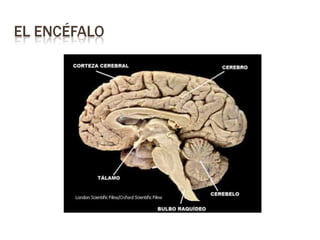 Este documento describe el sistema nervioso y endocrino. Explica que el sistema nervioso percibe estímulos internos y externos y genera respuestas, manteniendo el equilibrio del cuerpo. Está formado por el sistema nervioso central, que incluye el encéfalo y la médula espinal, y el sistema nervioso periférico. El documento también describe las neuronas, el impulso nervioso, y los diferentes tipos de neuronas. Finalmente, cubre brevemente el sistema endocrino y las hormonas.