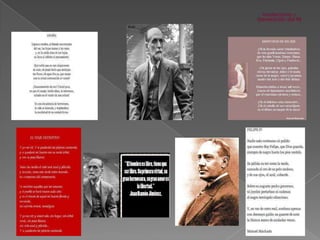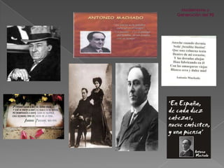El documento analiza la evolución de la literatura española desde finales del siglo XIX, destacando la superación de la división entre modernistas y noventayochistas como dos aspectos de un mismo movimiento. Se enfoca en las características del modernismo, representado por Rubén Darío, y de la Generación del 98, cuyas obras abordan la decadencia de España y temas existenciales, utilizando un estilo sobrio y directo. Autores como Unamuno, Baroja y Valle-Inclán son tratados como figuras clave de estas corrientes, cada uno aportando su perspectiva única sobre la realidad social y cultural de su tiempo.
