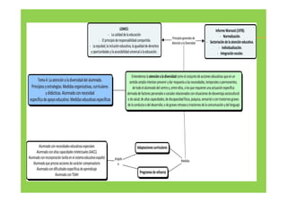 El documento aborda la atención a la diversidad del alumnado en educación, destacando principios y estrategias organizativas, curriculares y didácticas para atender las necesidades específicas de apoyo educativo. Se enfatiza la importancia de adaptar el currículo y las metodologías para garantizar la inclusión y equidad en el aprendizaje, considerando factores sociales, culturales y de capacidades. También se presentan medidas específicas para alumnos con dificultades de aprendizaje, altas capacidades y aquellos que requieren apoyo educativo, enfatizando programas de refuerzo y adaptación curricular.