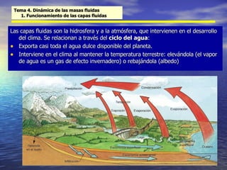 El documento trata sobre la dinámica de las masas fluidas en la Tierra. Explica el funcionamiento de la atmósfera y la hidrosfera, la circulación atmosférica vertical y horizontal, el ciclo hidrológico, la dinámica oceánica y conceptos básicos de climatología como las precipitaciones y los frentes climáticos.
