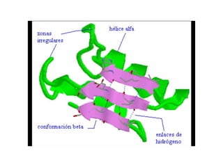 Las proteínas están formadas por la unión de moléculas más pequeñas llamadas aminoácidos. Existen alrededor de 20 aminoácidos diferentes que forman parte de las proteínas. Los aminoácidos se unen mediante enlaces peptídicos para formar cadenas polipeptídicas. Estas cadenas adquieren una estructura tridimensional compleja a través de cuatro niveles: estructura primaria, secundaria, terciaria y cuaternaria. Las proteínas cumplen funciones estructurales, enzim