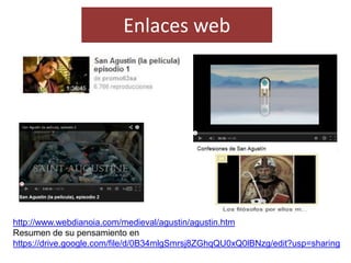 San Agustín vivió entre los siglos IV y V d.C. en el declive del Imperio Romano. Recibió influencias del platonismo, neoplatonismo, estoicismo y del pensamiento cristiano temprano. Su pensamiento influyó enormemente en la filosofía y teología posteriores. Algunas de sus ideas clave incluyen que la razón y la fe son complementarias, que Dios creó el mundo ex nihilo, y que el mal no tiene entidad propia sino que es una ausencia de bien.