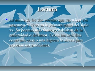Este documento presenta información sobre varios temas relacionados con la lectura y la escritura. Explica que la autora de los poemas que se van a leer era uruguaya y vivió en la primera mitad del siglo XX. También define términos como palabras primitivas, derivadas, diptongos, triptongos y hiatos. Además, describe los grados del adjetivo calificativo y da ejemplos. Por último, explica qué es un pie de foto y su importancia al ilustrar noticias con imágenes.