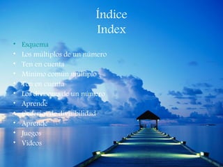 Este documento trata sobre la divisibilidad. Explica conceptos como los múltiplos y divisores de un número, el mínimo común múltiplo, y criterios de divisibilidad como por 2, 3, 5, 6, 9 y 10. También incluye ejemplos y enlaces a juegos y videos sobre este tema.