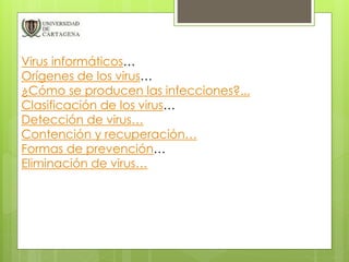 Este documento describe los orígenes y tipos de virus informáticos, cómo se propagan e infectan computadoras, formas de detección, contención y eliminación, así como métodos de prevención. Explica que un virus es un programa que se copia a sí mismo y altera el funcionamiento normal de una computadora sin permiso del usuario, y que existen varias clasificaciones como gusanos, caballos de Troya, virus polimórficos y más. También detalla señales comunes de infección y los pasos a seguir para eliminar un virus como actual