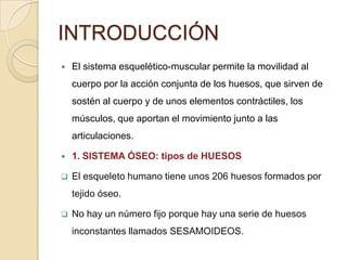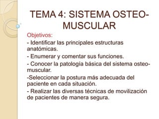 El documento resume el sistema osteomuscular, incluyendo los objetivos de identificar sus estructuras y funciones, así como conocer su patología básica. Describe los tipos de huesos, su estructura, función y clasificación del esqueleto en axial y apendicular. Explica las articulaciones, clasificadas en sinartrosis, anfiartrosis y diartrosis según su movilidad, y sus componentes como el cartílago, cápsula, ligamentos y membrana sinovial.