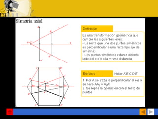 Este documento describe diferentes tipos de transformaciones geométricas, incluyendo homologías, afinidades e inversiones. Explica conceptos como razón simple, razón doble y cuaterna armónica. También introduce la geometría proyectiva y cómo se conservan propiedades bajo proyecciones.