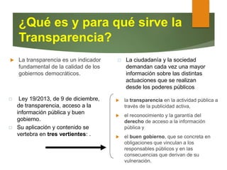 Este documento trata sobre la transparencia en la Administración de la Junta de Comunidades de Castilla-La Mancha. Explica que la transparencia es fundamental para la calidad de los gobiernos democráticos y se basa en la publicidad activa, el acceso a la información pública y el buen gobierno. Establece los sujetos obligados a la transparencia como la Administración regional, organismos públicos y algunas entidades privadas. También describe los principios de la transparencia, los derechos de acceso a la información y sus límit