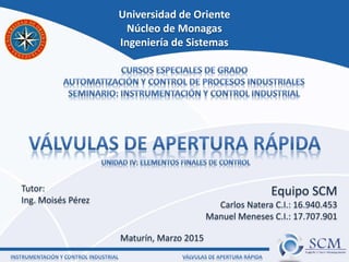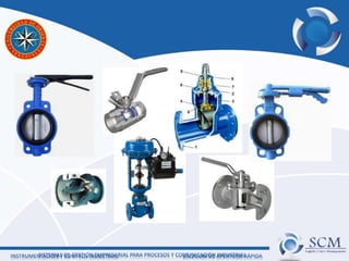 El documento explora el funcionamiento y clasificación de las válvulas, elementos cruciales para el control de fluidos en diversas aplicaciones, desde sistemas domésticos hasta industriales. Se detallan diferentes tipos de válvulas, como las de apertura lenta y rápida, así como sus aplicaciones y características técnicas. Además, se destaca la importancia de la válvula de control dentro de los procesos industriales para regular caudales.