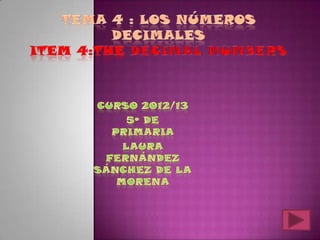 Este documento presenta conceptos sobre números decimales. Explica que un número decimal se puede dividir en unidades, décimas, centésimas y milésimas. Muestra cómo escribir y comparar números decimales en notación decimal y fraccionaria. También describe cómo ordenar y aproximar números decimales en la recta numérica.