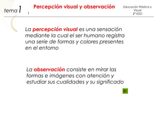 Este documento presenta información sobre la percepción visual y la observación. Explica que la percepción visual nos permite captar formas y colores del entorno y que la observación implica mirar con atención las cualidades y significados de las imágenes. También describe principios perceptivos como la figura y el fondo, y efectos visuales como la proximidad y el contraste. Además, introduce el tema de las ilusiones ópticas y la comunicación visual.