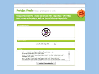 Este documento proporciona instrucciones para agregar un reloj como gadget a un blog en 3 pasos: 1) visitar un sitio web de relojes flash y copiar el código HTML de un diseño, 2) ir al blog, seleccionar "añadir gadget" y pegar el código HTML en la opción de HTML/JavaScript, y 3) guardar y publicar los cambios para ver el nuevo reloj en el blog.