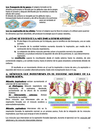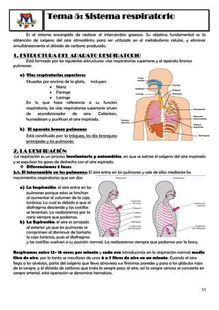 El documento describe el sistema respiratorio y su función de realizar el intercambio gaseoso para obtener oxígeno y eliminar dióxido de carbono. El sistema está formado por las vías respiratorias superiores como la nariz y la laringe, y el aparato bronco-pulmonar incluyendo la tráquea y los pulmones. La respiración consiste en la inspiración donde el aire entra en los pulmones, y la espiración donde el aire es expulsado. Durante este proceso, el oxígeno pas