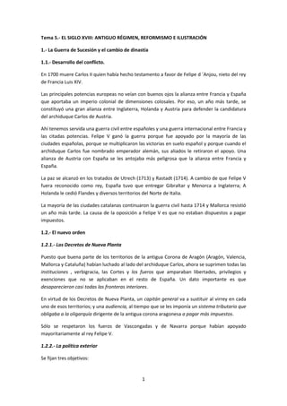 Este documento describe el siglo XVIII en España, incluyendo la Guerra de Sucesión Española y el cambio de dinastía a los Borbones, las reformas borbónicas para centralizar el estado y modernizar la economía, y los esfuerzos de los ilustrados para promover el desarrollo agrícola, industrial y comercial.