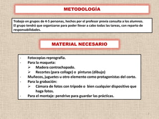 Este documento describe un proyecto escolar para crear un cortometraje de animación utilizando técnicas TIC. Los estudiantes trabajarán en grupos para seleccionar una idea, crear un guión literario y técnico, construir maquetas de escenarios, grabar fotogramas, montar el video, y publicarlo en un blog. El proyecto se evaluará considerando varios criterios como el guión, la maqueta, el corto finalizado y la actitud de trabajo.